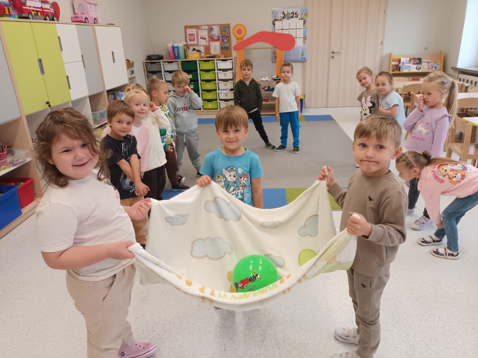 przenosząc piłki na chuście – to było prawdziwe wyzwanie zespołowe! Podczas zabawy ruchowej „Razem damy radę” dzieci w parach wykonywały różne zadania,