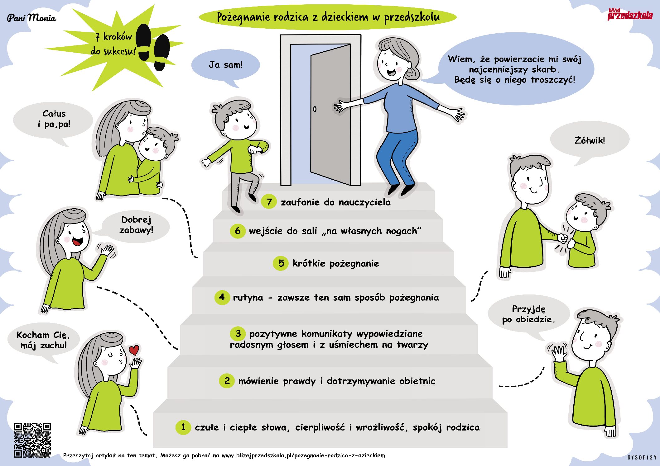 Krótki pożegnalny rytuał – warto wypracować prosty gest (np. przytulenie, pomachanie z okna), który da dziecku poczucie bezpieczeństwa i przewidywalności.