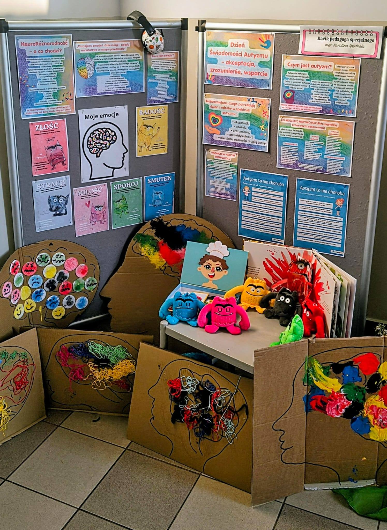 Efektem naszych działań jest wystawa na półpiętrze, prezentująca prace dzieci oraz materiały o emocjach, autyzmie i neuroróżnorodności.